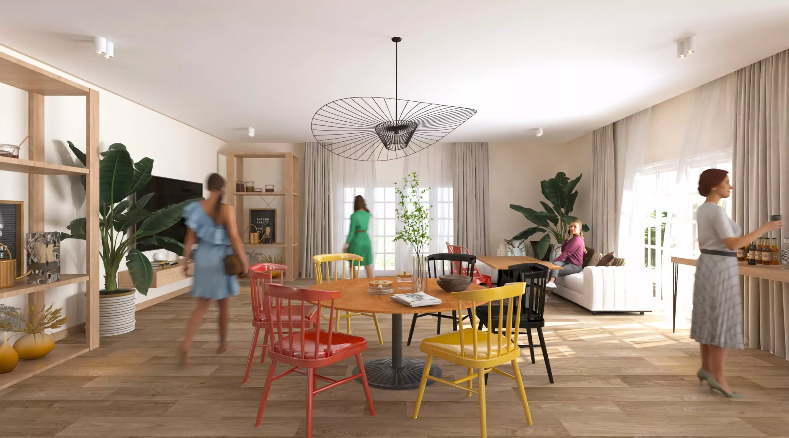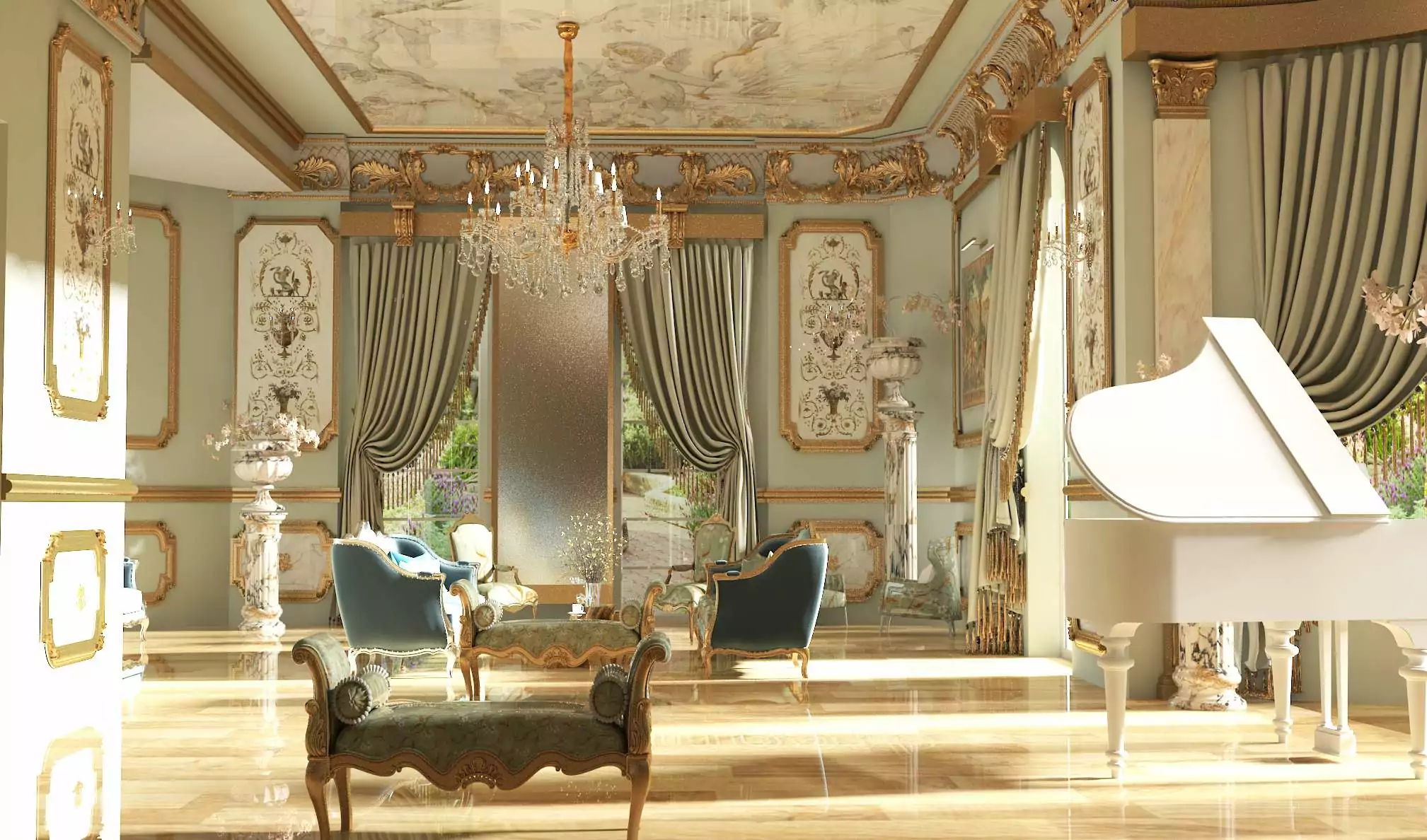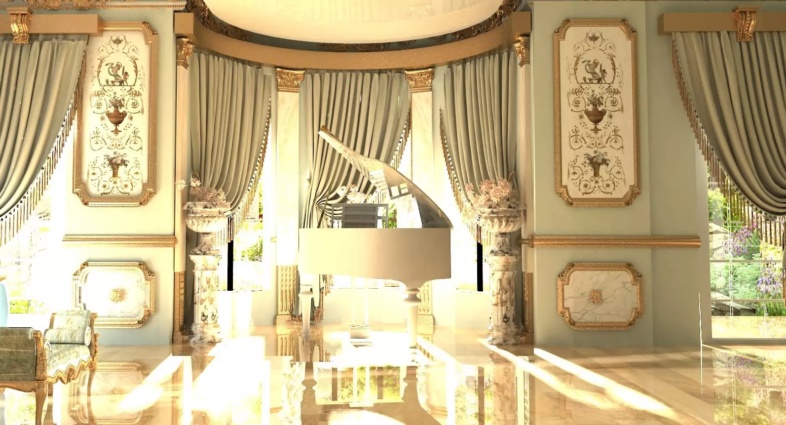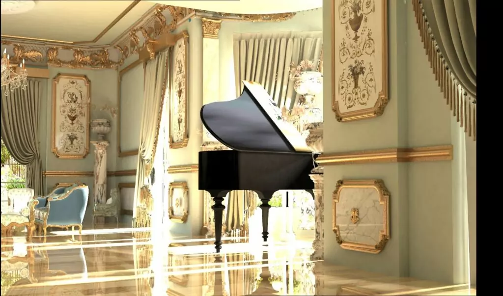 "We felt the need to place a piano in the center of this living room, adding flowers throughout to infuse more life into it. Not to mention the pilasters behind the piano, which emphasize the height and create a sense of grandeur."