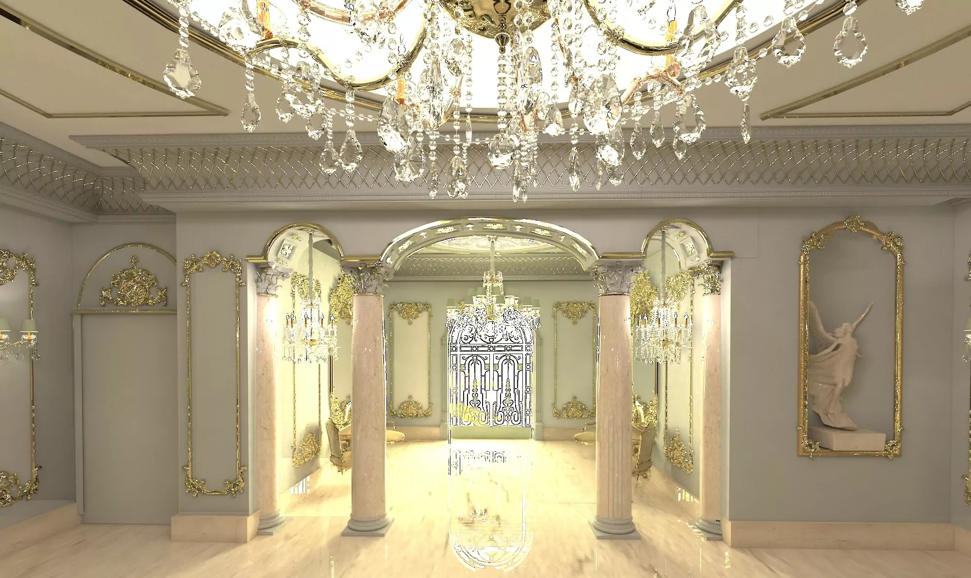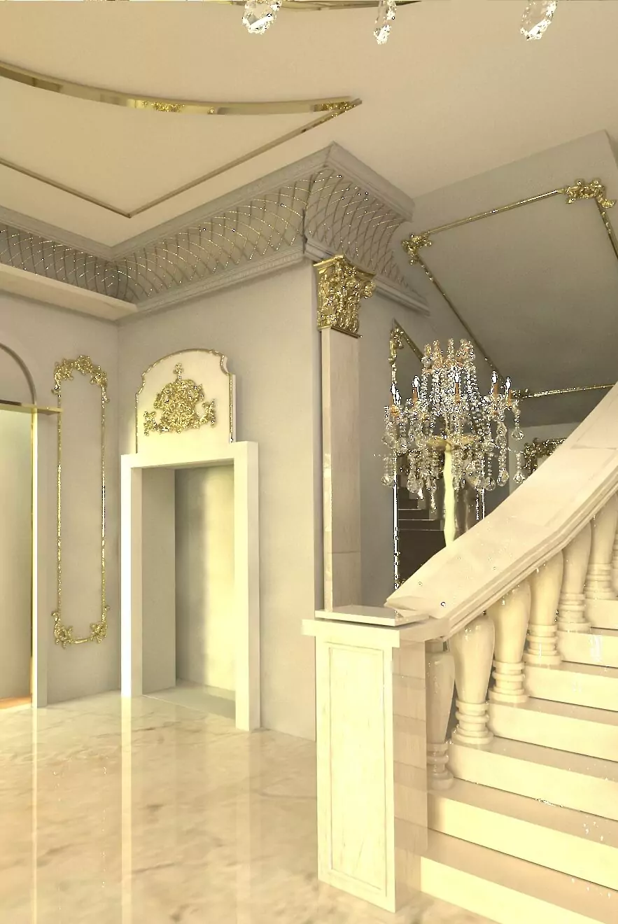 For this grand entrance, we undertook a renovation project, preserving the original moldings while giving them a fresh update with a subtle shade of gray. This color enhances the golden details on the walls, creating an elegant contrast. By adding marble posts and pillars, we introduced a sense of grandeur to the entrance, further enhancing its majestic appearance. The carefully restored details enrich the overall aesthetic, creating a welcoming and sophisticated atmosphere.