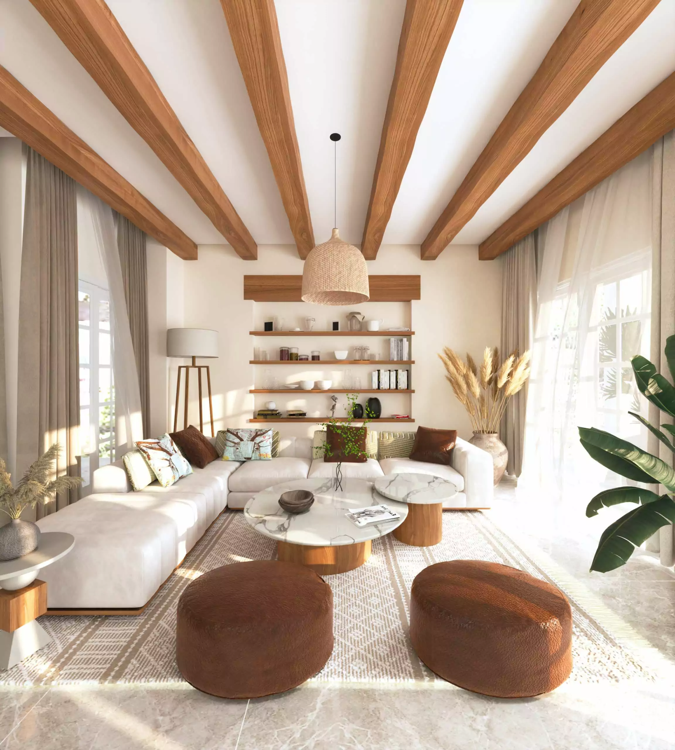 In this exceptional living room, flooded with natural light, architectural elements like ceiling beams add a touch of character and warmth to the entire space, creating a comfortable and inviting ambiance.