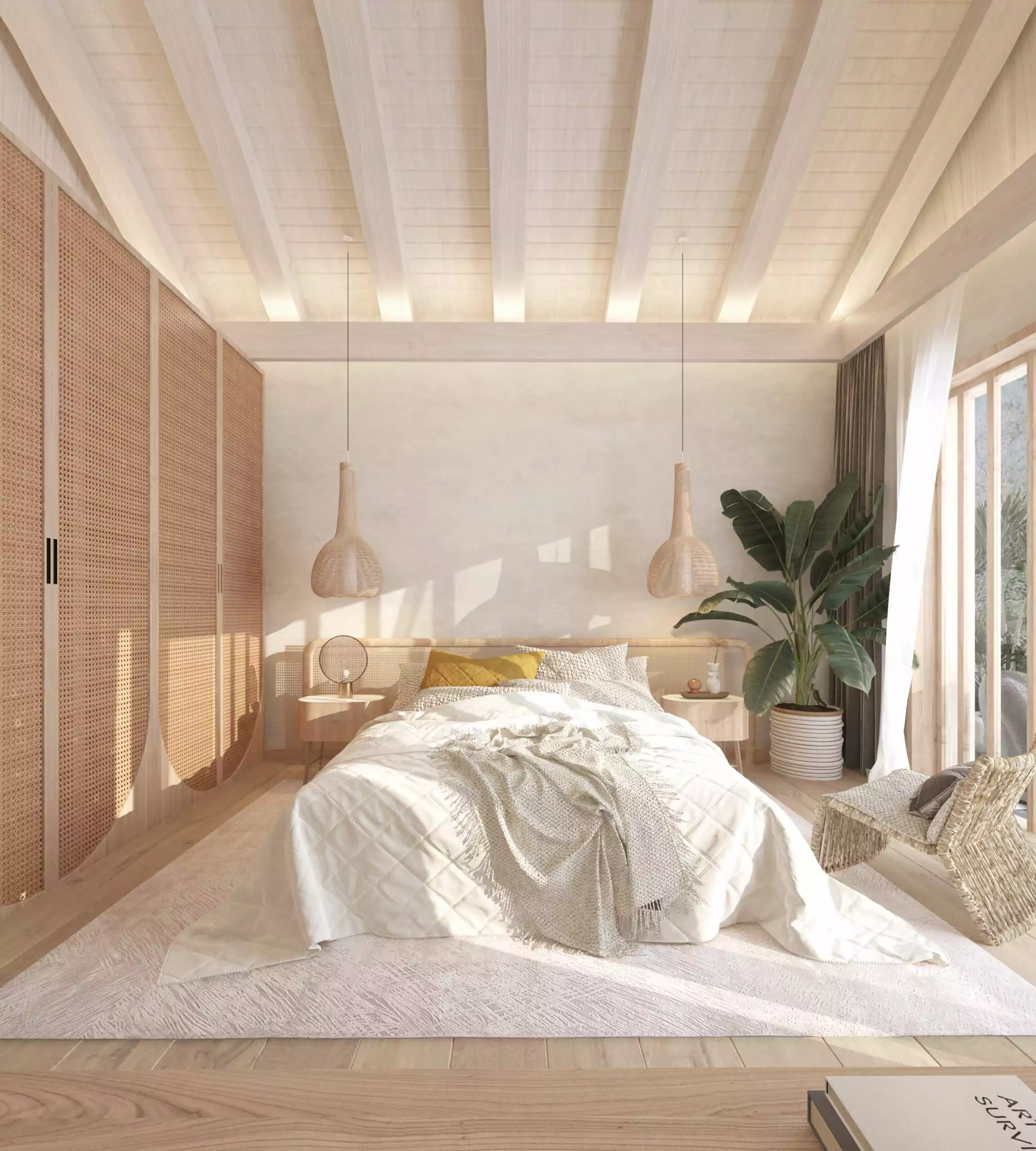 "In this high-ceilinged bedroom, we designed a light wooden structure on the ceiling that adds a rustic touch to the space. Every material and color has been carefully chosen to evoke nature, in order to maintain this spirit of calm and serenity, perfect for moments of tranquility."