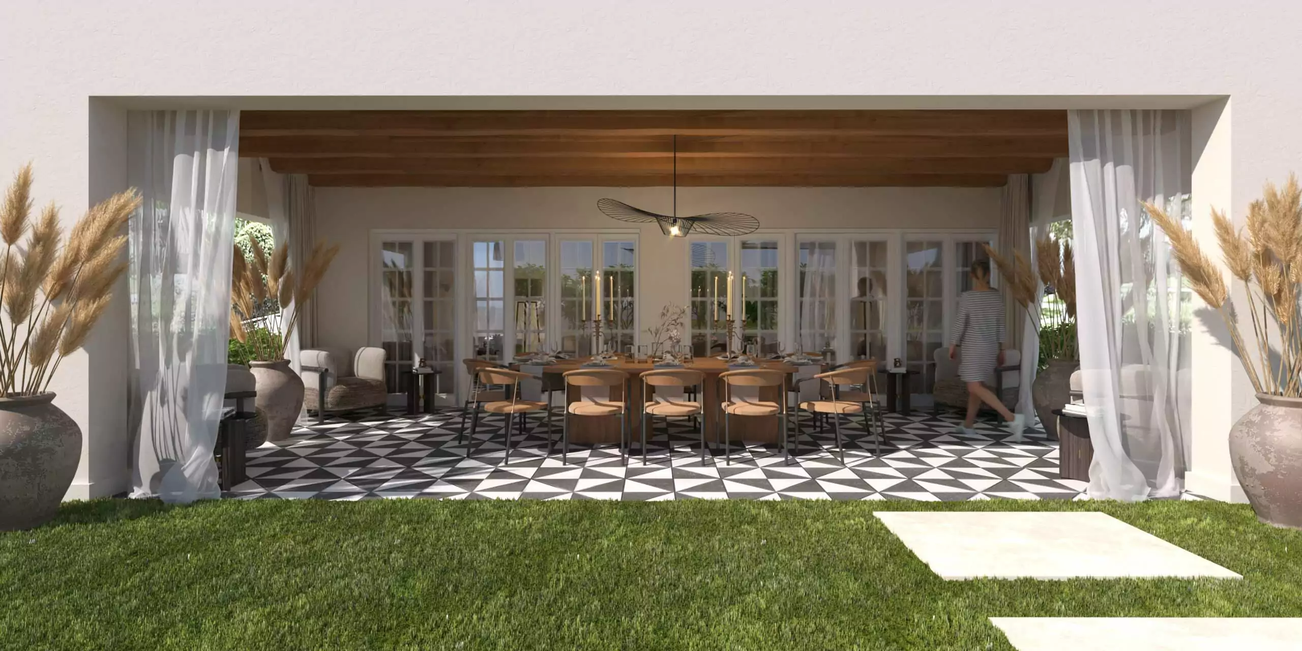 Discover our outdoor dining space, perfect for a vacation home. On the ceiling, beautiful wooden beams have been integrated to evoke the natural character of the place. The floor is adorned with cement tiles that bring a special touch to this dining area, creating an elegant contrast with the greenery of the outdoor environment.