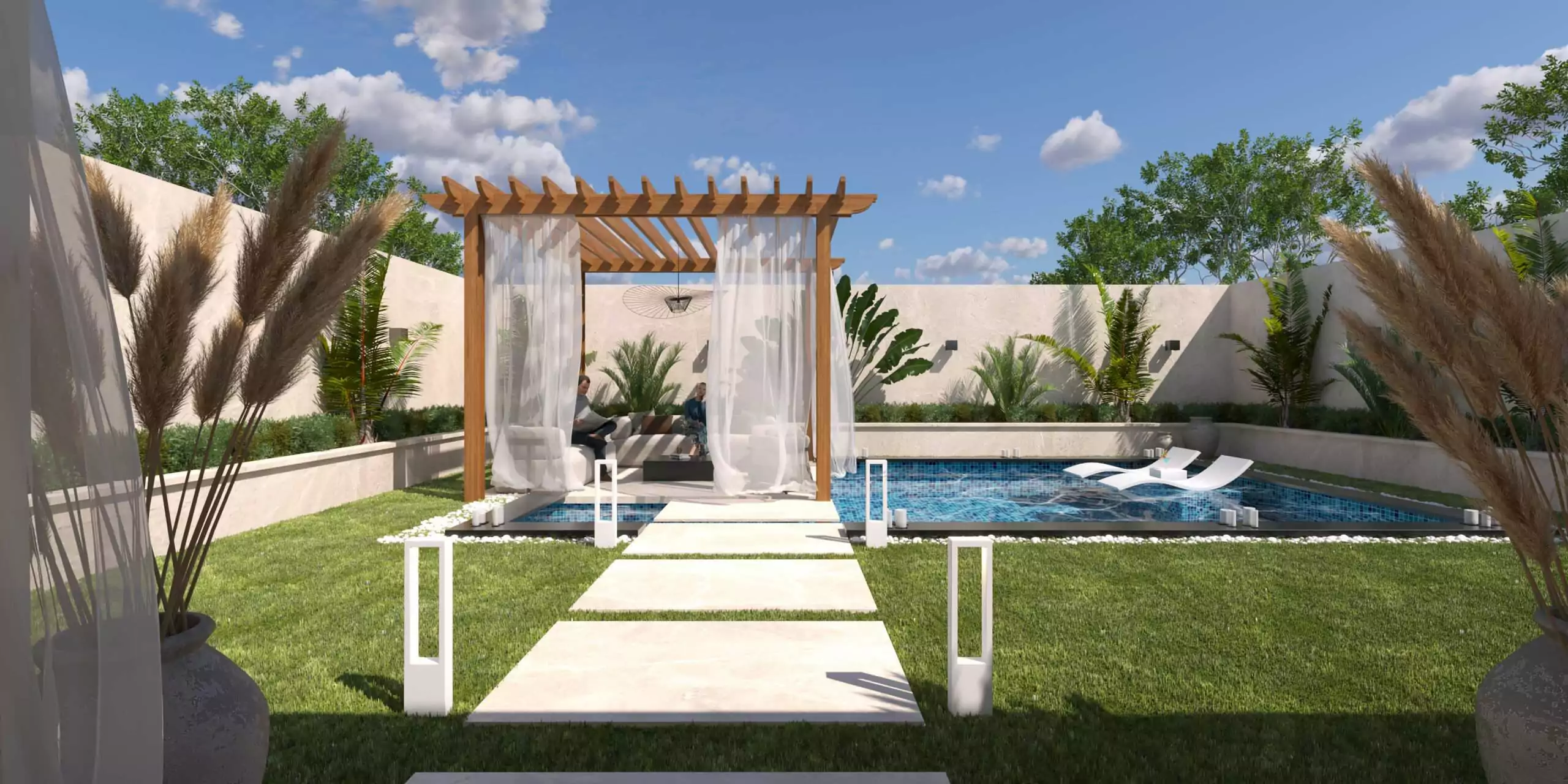 You will take a path leading to a pergola in the heart of the water, which is an ideal space to relax while enjoying the soothing ambiance of the water. It's the perfect place to create memorable moments and experience tranquility in the heart of this unique outdoor space.